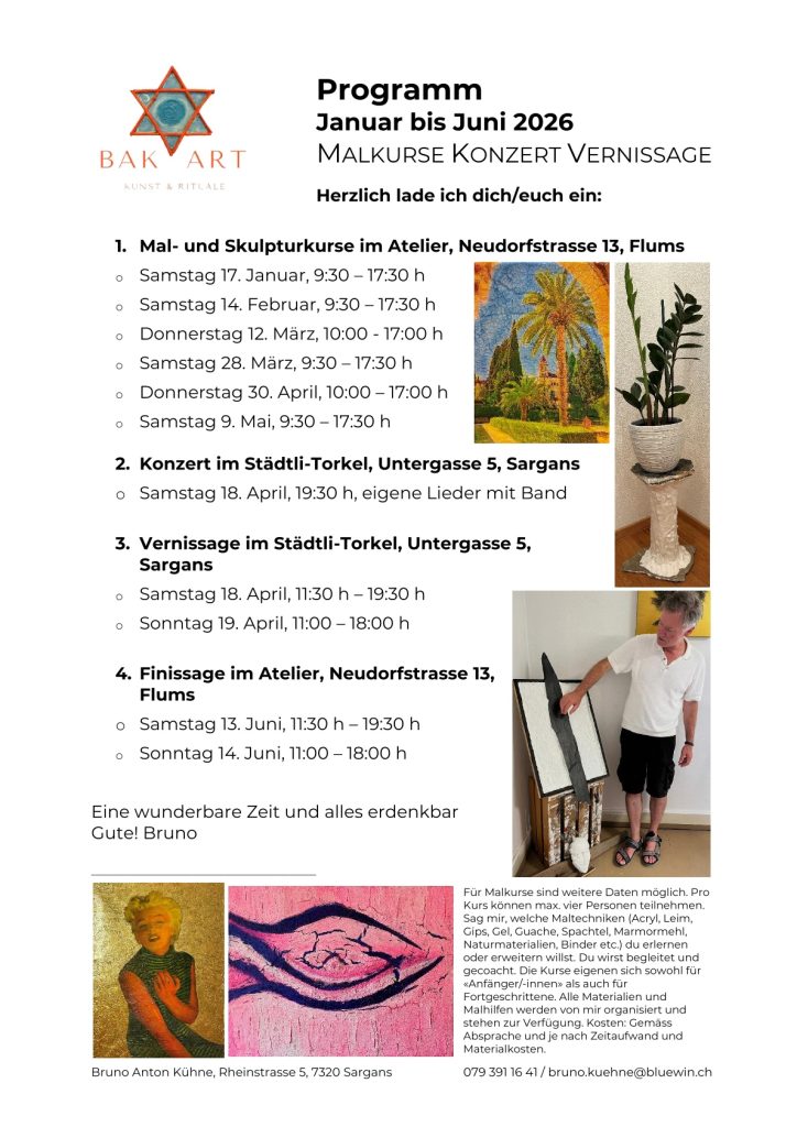 Vernissage und Finisage zugleich Mit der Vernissage hat es am Wochenende vom 30.6.2025 Einblick gegeben in die Werke von Bruno A. Kühne, der an der Neudorfstrasse 13 in Flums, seit drei Jahren künstlerisch tätig ist. Weiterlesen